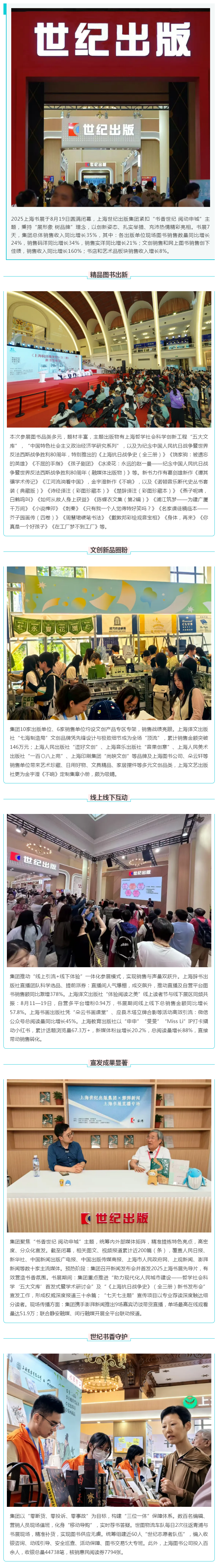 2025上海书展于8月19日圆满闭幕,上海世纪出版集团紧扣“书香世纪 阅动申城”主题,秉持“展形象 树品牌”理念,以创新姿态、扎实举措、充沛热情精彩亮相。书展7天,集团总体销售收入同比增长35%,其中:各出版单位现场图书销售数量同比增长24%,销售码洋同比增长34%,销售实洋同比增长21%;文创销售和网上图书销售创下佳绩,销售收入同比增长160%;书店和艺术品板块销售收入增长8%。